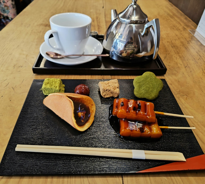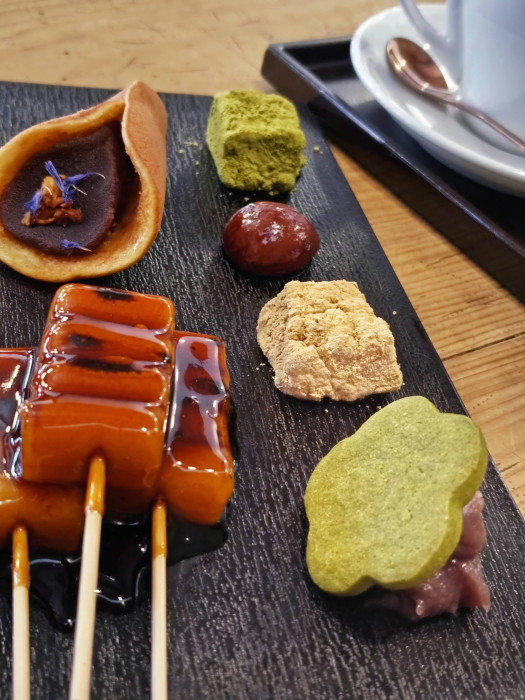 梅園名物のみたらし団子・わらび餅2種類・栗の渋皮煮・抹茶クッキーにあんの花束という豪華な盛り合わせ!