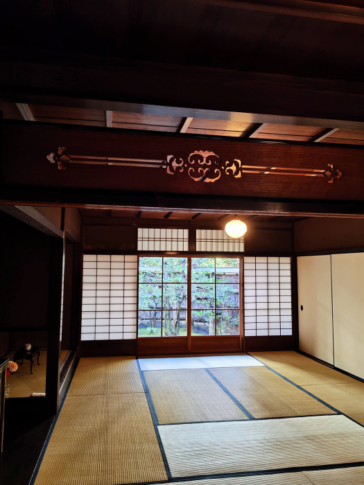 京格子やむしこ窓、しっとりとした風情が楽しめる庭園や茶室、吹き抜けの梁が素晴らしい台所など、すべてが美しく、歴史を感じる建物でした。