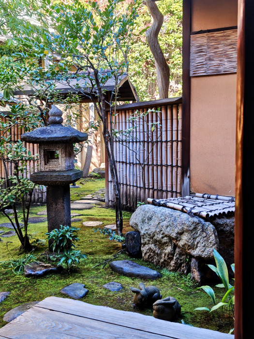 2羽のうさぎがちょこんと並ぶ露地庭、黒文字(お抹茶をいただく際のお菓子についている楊枝のようなもの)で作られた柴垣が特徴的な座敷庭、シンプルな中にも遊び心がある仏間のお庭。