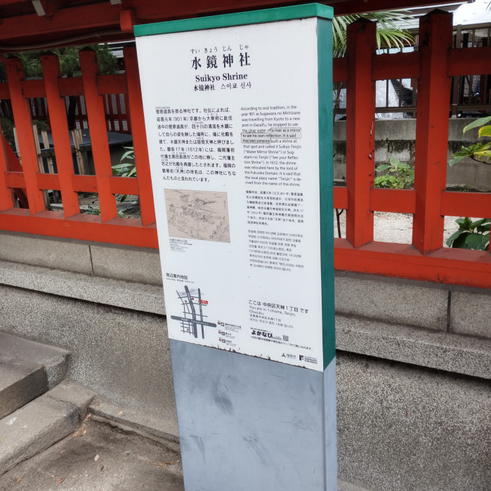 平安時代の優れた学者であった菅原道真は、政治家としても有名で、学問の神として祀られています。菅原道真は「太宰府天満宮?」と思いましたが、こちらの水鏡神社は、左遷されて水面に映る自身のやつれた姿をみて嘆き悲しんだことで造られた神社とか。大宰府に移住する前に博多の土地を訪れていたようです。