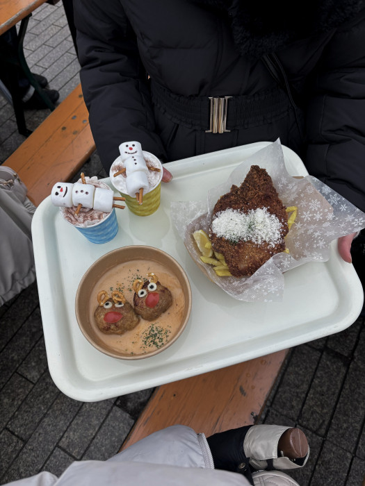 私はゆきだるまのましゅまろが乗ったホットチョコレート、となかいのミートボール、シュニッツェルを注文し、楽しみました💕