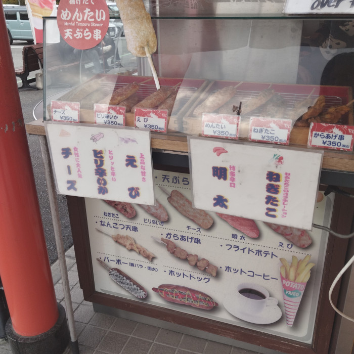 「梅ソフト」はどんな味かなーと思いながら待っていると、揚げたてアツアツの天ぷら串が出来上がりました!串になっているから食べやすい。店舗のすぐ前にベンチもあり、そのままいただきまーす🌟