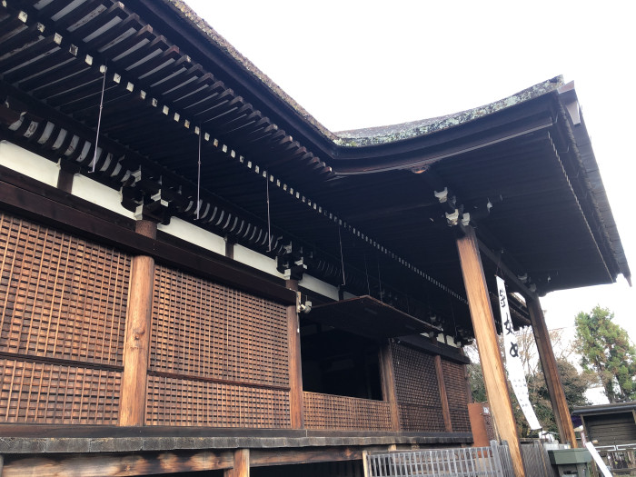 本堂の屋根は、伝統的な入母屋造(いりもやづくり)の檜皮葺(ひわだぶき)。