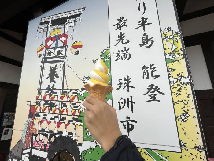 道の駅ずすなりでは、定番商品「揚げ浜塩ソフト」と「スズかぼちゃソフト」のミックスを購入。珠洲市の農家による名産品「えびすかぼちゃ」を使ったソフトクリームは復興へと歩みを進める地域で味わう「限定商品」。今冬のスイーツとして登場しました。日焼けなどをした規格外品のかぼちゃの廃棄を減らそうと、ペーストにしてソフトクリームに練り込んでいます。