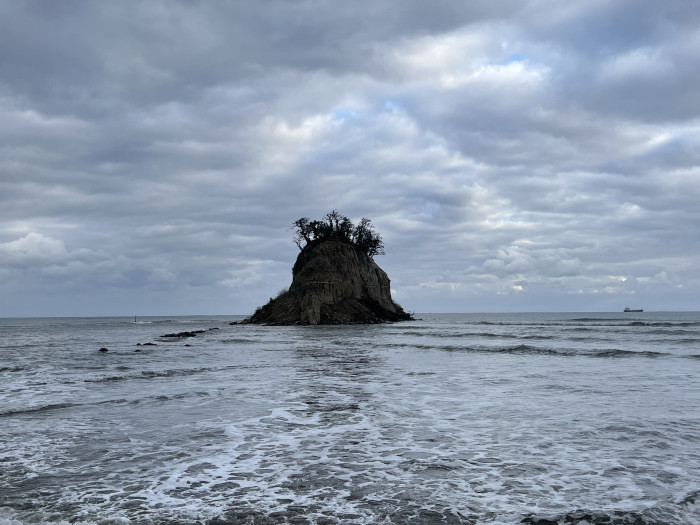 見附島は地震の影響で以前より小さくなっています。自然の力の大きさを実感。静かな中にも訪れる人の姿があり、復興への歩みを感じる場所でした。