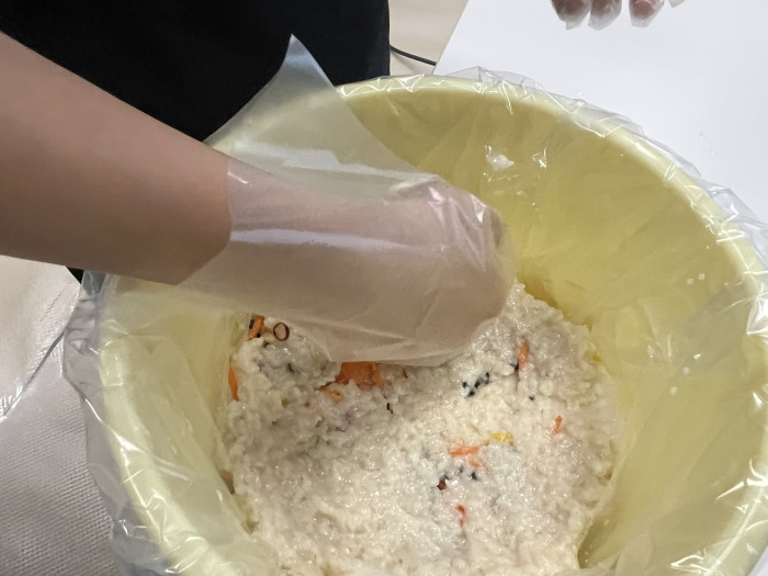 その後はいよいよ実践。今回は小学生も参加しやすいように、かぶや鰤の下準備はすべて済んでおり、参加者は「かぶに鰤を挟み、麹で作った甘酒を重ねていく」という工程を体験します。作業自体はとてもシンプルですが、ひとつひとつ丁寧に重ねていくことで、「食べものをつくる」感覚が自然と伝わってきます。