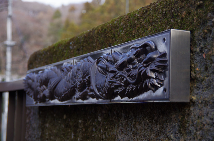 駐車場に車を停め、橋を渡ると、龍の姿をかたどったレリーフが目に入ります。