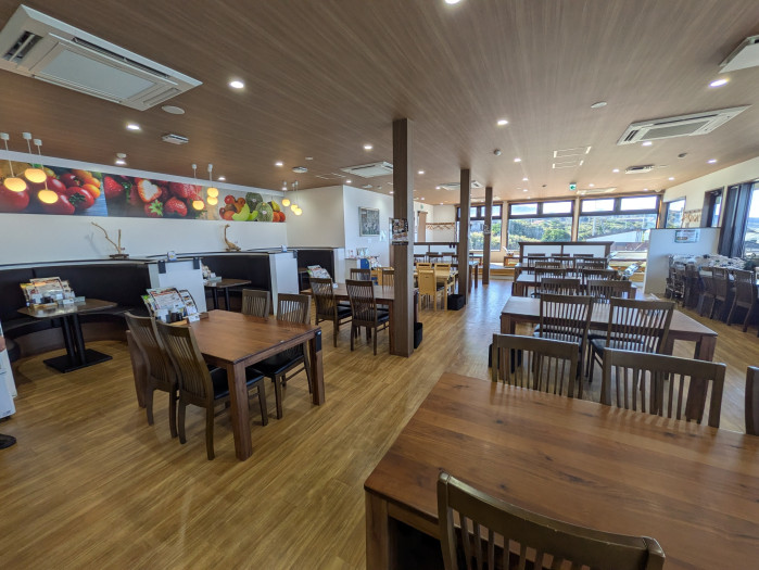 2階は座席数80席のレストランフロア。地元ブランドの松永和牛を使ったしゃぶしゃぶや鉄板焼き、日本海の恵みをいかした海鮮料理、採れたて野菜のサラダなど、素材の良さを素直に味わえるメニューがそろってます。サラダは食べ放題なのは野菜好きにはたまらない。ランチからディナー、ピッツァや宴会まで幅広く対応しており、旅の途中にも、地元の集まりにもぴったりです。