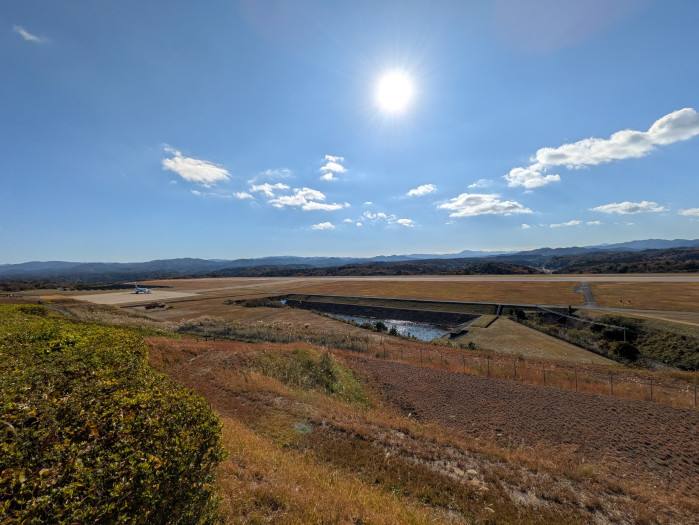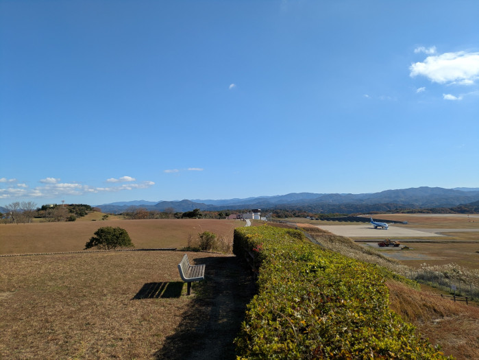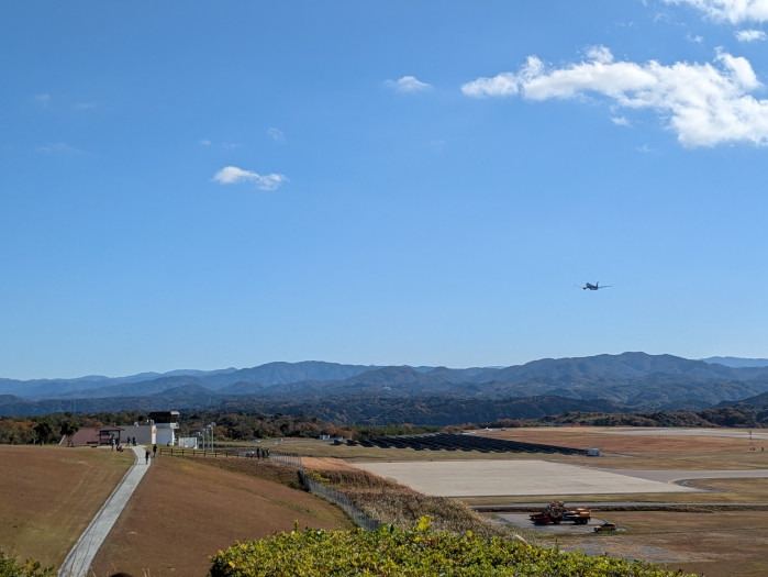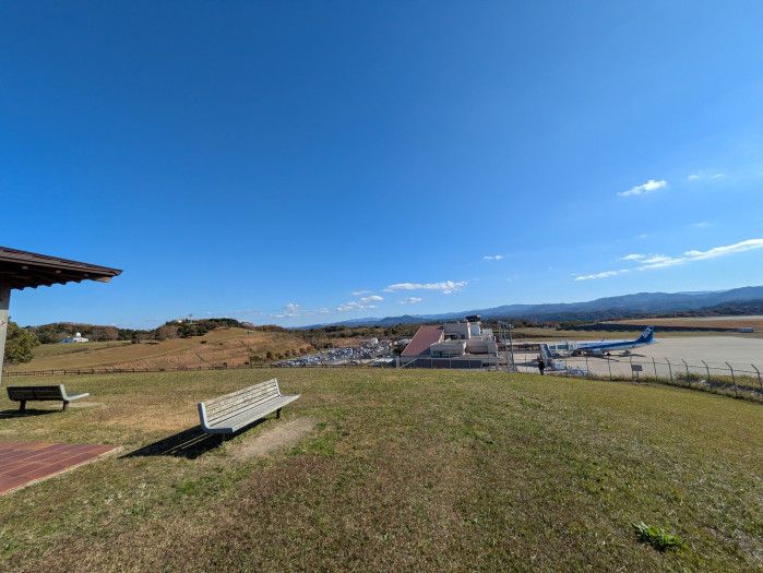 この日は快晴に恵まれ、芝生の先に延びる滑走路から、飛行機が飛び立つ場面に出会えました。大地を離れた機体がゆっくりと空へ昇り、やがて青空の中へ溶け込んでいく様子は、時間を忘れて眺めてしまうほど印象的。北側に目を向ければ、日本海が陽を受けて輝き、空と海、そして飛行機が重なる景色が広がっていました。