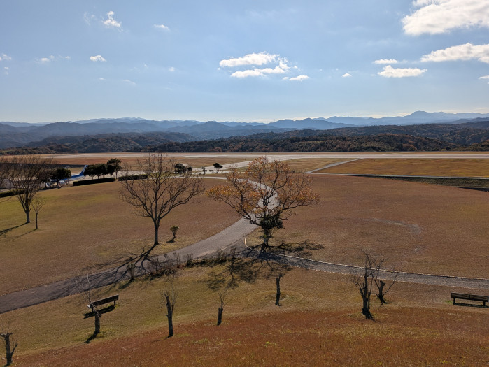 島根を巡る旅の合間、思いがけず立ち寄ることになったのが、空港のすぐそばにある「風の丘広場」でした。なだらかな丘の上には一面の芝生が広がり(6.0ha)、名前に違わず、心地よい風が絶えず吹き抜けています。空港施設に隣接しているとは思えないほど、視界がひらけた穏やかな空間です。