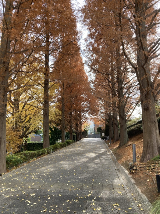 天高く聳えるメタセコイア並木のプロムナード。