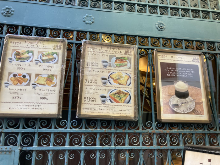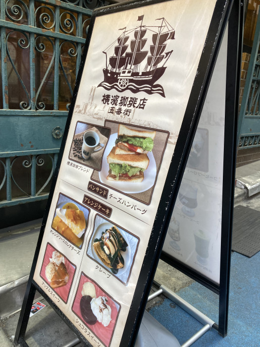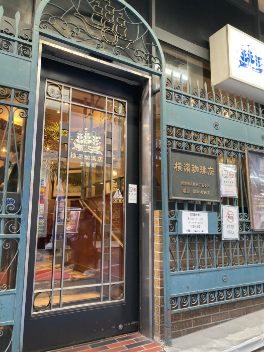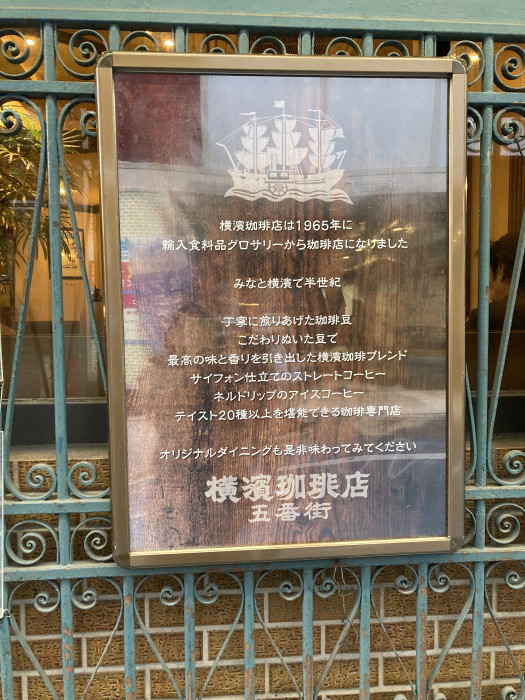 トレードマークの帆船、古風なフォントの表札、蔓草のような面格子・・・異国情緒を漂わせるこの建物は、五番街のレトロ代表とも言うべき『横濱珈琲店五番街』。