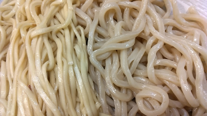 「夫婦つけ麺」という人気メニューですが、太麵と中太平麺の2種類が楽しめるようになっています。