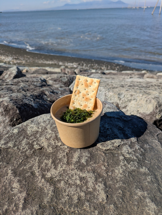 食事にいただいたのは、地元でとれた貝や海藻、海苔を使ったクラムチャウダー。