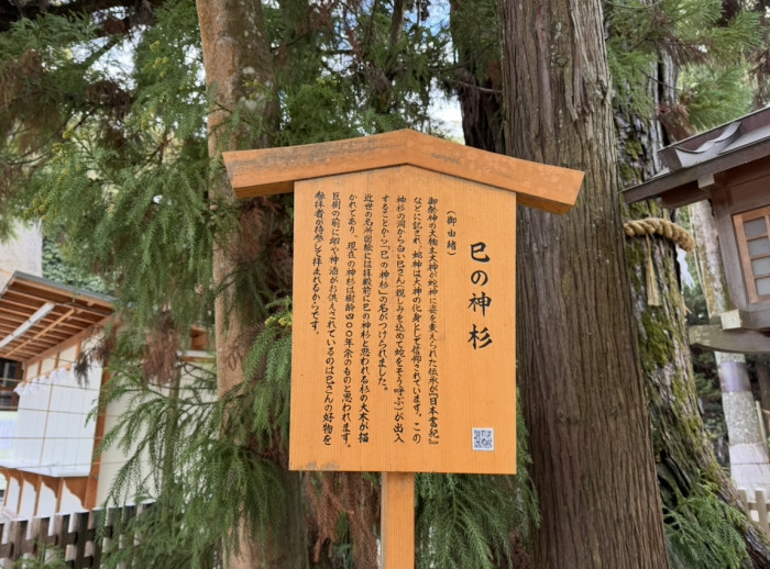 拝殿前に立つ「巳の神杉(みのかみすぎ)」と呼ばれる杉の木は、白蛇(大物主大神の化身)が棲むと伝わる“霊木”です。