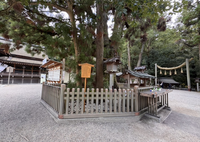 拝殿前の斎庭(ゆにわ)の南側に位置しており、二股に分かれた大きな杉は、瑞垣で囲まれ、特別な霊木として祀られています。