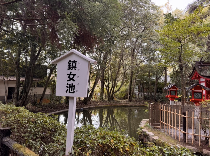 市杵島姫神社 が鎮座する小島の周りは「鎮女池(しずめいけ)」と呼ばれる池があり、「女性の心を鎮める」という意味が込められているそうです。