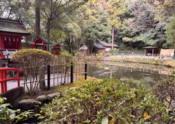 弁財天(弁天さん)としても親しまれる神社。池の静けさと朱の鳥居の対比が美しい神社です。