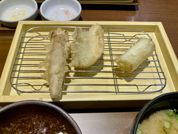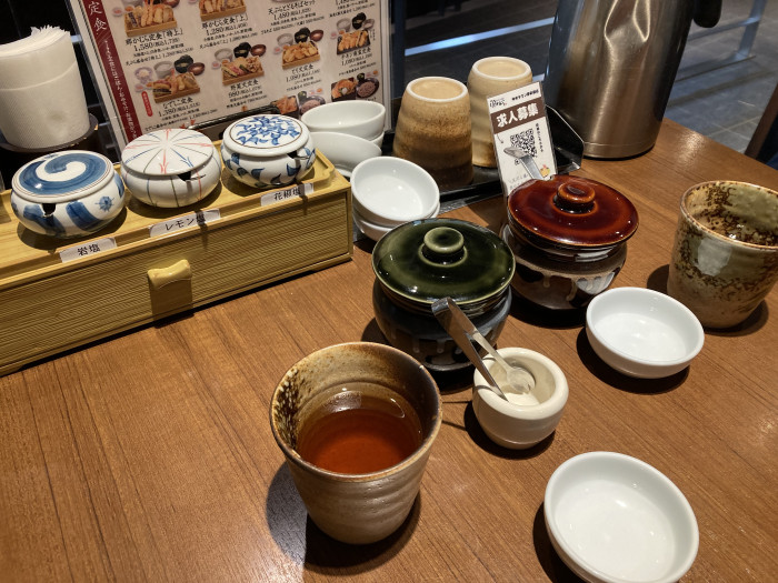 岩塩、レモン塩、山椒塩の3種類と天つゆ、全て自分の好みで味わえます。