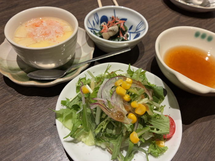 さっそく、お通しとサラダ、茶碗蒸し。程よいスピードで運ばれてくる前菜たちもやっぱりどれも美味しい。丁寧に下処理、味付けされているのが伝わります。