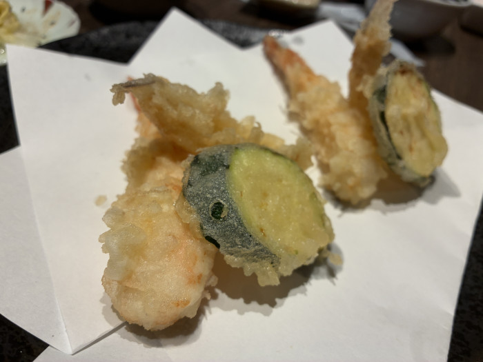 お次は天ぷら、第1弾。海老とズッキーニ、きす。椿油を使用していることもあり、ふわっとした口当たりながらさくさく、からっと揚がっています。水分量の高い野菜とも相性抜群!