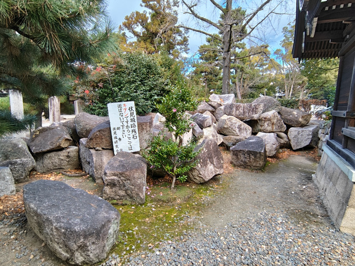 境内には「桃山天満宮」という天神さんもありますが、そちらには伏見城跡から出土した大きな石がたくさん(けっこう雑に)置かれています。