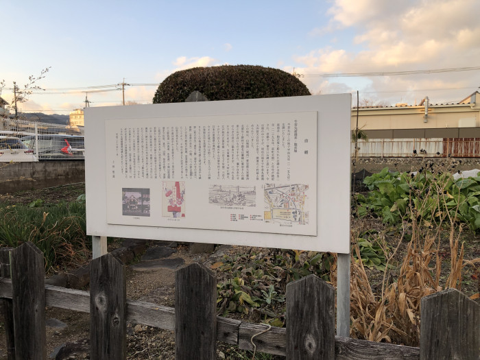 義経の産湯として使われたと伝わる井戸で、義経の生誕地ともされています。周囲は畑でしたが、歴史的なスポットであることを示す大きな看板が建っていました。