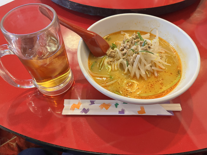 注文した烏龍茶と担々麺で、中華街を歩いた疲れをホッと癒します。