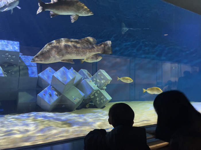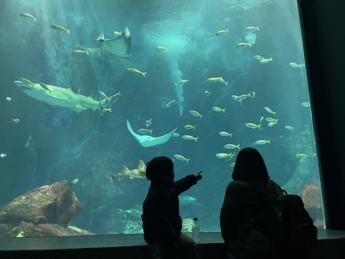 中央の巨大水槽は昔からずっと変わらず。スロープでゆっくりと2階から下りながら、遠目でもしっかりと楽しめます。ここでは大きなシロワニやマンタ、ハンマーシャークや鯵の群れなど、さまざまな魚が住んでいます。エレベーターにも窓がついて、水槽を眺めながら移動することもできます♪