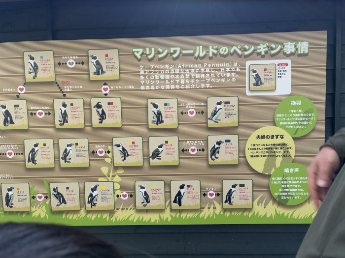外にある「かいじゅうアイランド」へ。ここでは、ガラス越しに近距離でペンギンの暮らしを覗くことができます。2024年、開館35周年を迎えて新たに作られたコーナーで、こんな“相関図”もあり。ちょっとしたドラマも楽しめます(笑)
