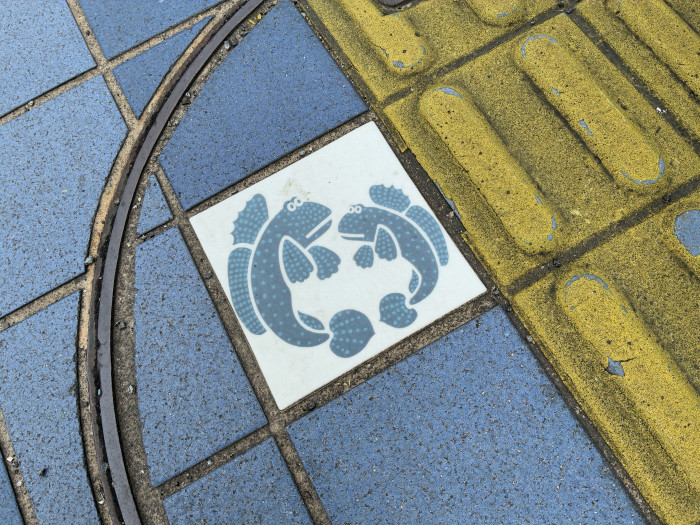 さてさて、3カ所目は少しだけ離れます。子どもの足でだいたい…2カ所目の場所から25分ほどでしょうか。思ったより距離があったけれど、車で行くのはもったいない。ということで散策しながら、佐賀ならではのマークを探してみました♪こちらは昔ながらの通り、タイル状の道に埋め込まれたムツゴロウ。