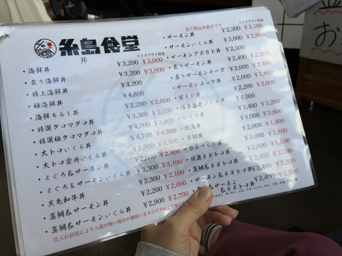 海鮮丼のメニューがずらり!これは迷うラインナップ。メニューはほかにも充実していて、定食ものも多くありました。種類によっては5,000円近くするものも…!少し意気込む値段ですが、福岡の長浜市場で選りすぐりの魚介たちをふんだんに使った1杯。そしてこの店舗では、唐津の市場から直送している食材も多く、そう考えると妥当な金額ともいえます。