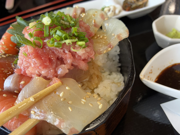「真鯛&サーモン丼」(2,200円)を注文。2種と思いきや、てっぺんにネギトロも♪器から溢れんばかりの大ぶりの刺身たち!つやつやとしていて、鮮度の高さを感じます。