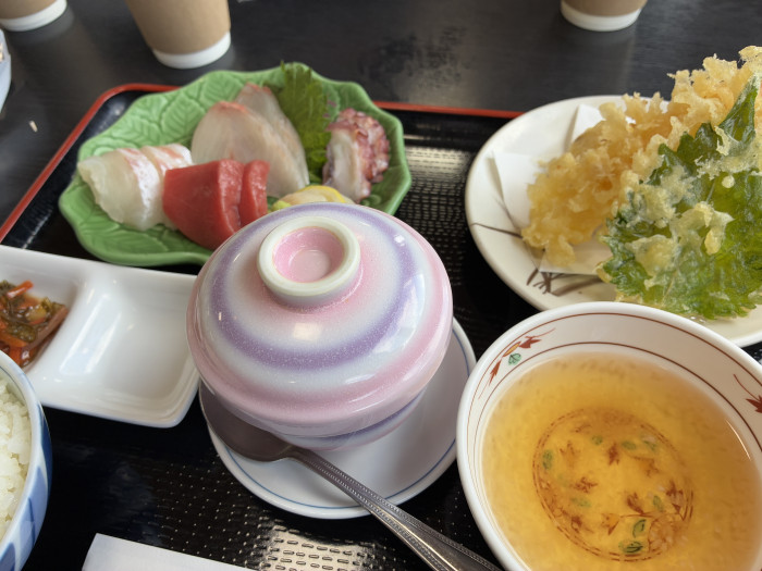 こちらは天刺定食。海鮮丼に限らず、魚介をメインとした定食メニューも充実しているので、自分好みをチョイスできます。天ぷらは立派な海老がメインでした♪海鮮丼も刺身も、醤油の種類を3つから選べました。それぞれボトルで卓上に置いてあり、どれも店舗オリジナルのものでした。九州らしい甘い刺身醤油はもちろん、ごま油が効いた香ばしいタイプもあったりと、味変も楽しめます。レジ横で販売もされていました。