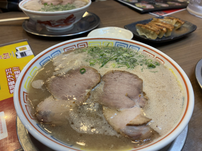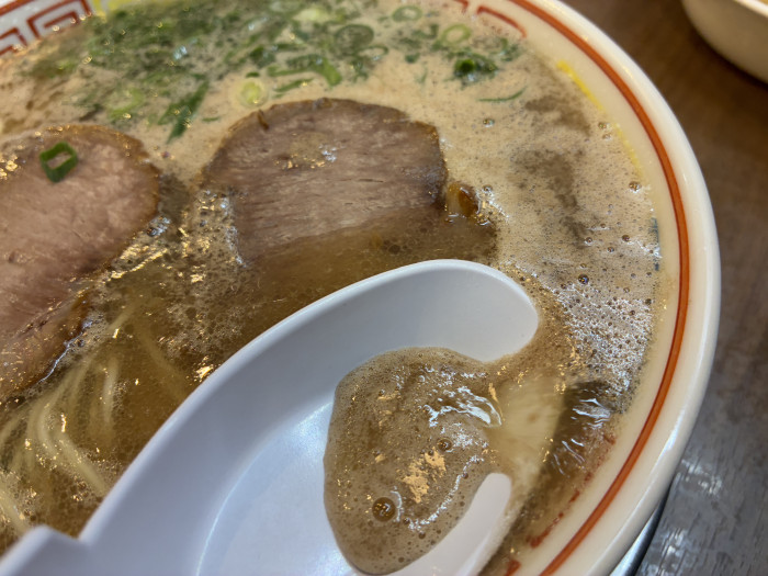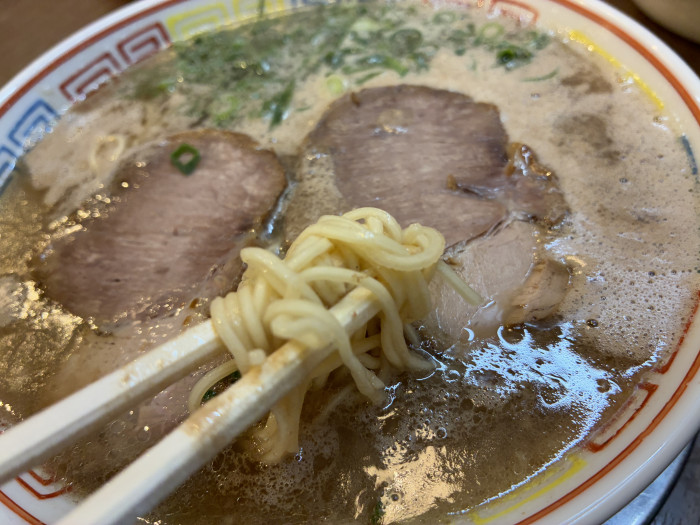 固めの麺をくぐらせながら啜るのが博多流。麺はやや太め寄りの細麺。チャーシューはしっかりと火が通ったタイプで歯ごたえアリ。これをまたしっかりとスープに浸して食べるのがベストです。