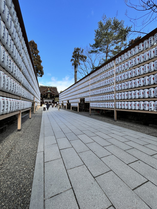 初詣の時期とは違い、境内は人も少なく、清々しい雰囲気に包まれていました。修学旅行中の学生や、お宮参りに訪れた家族の姿も見られ、落ち着いて参拝することができました。