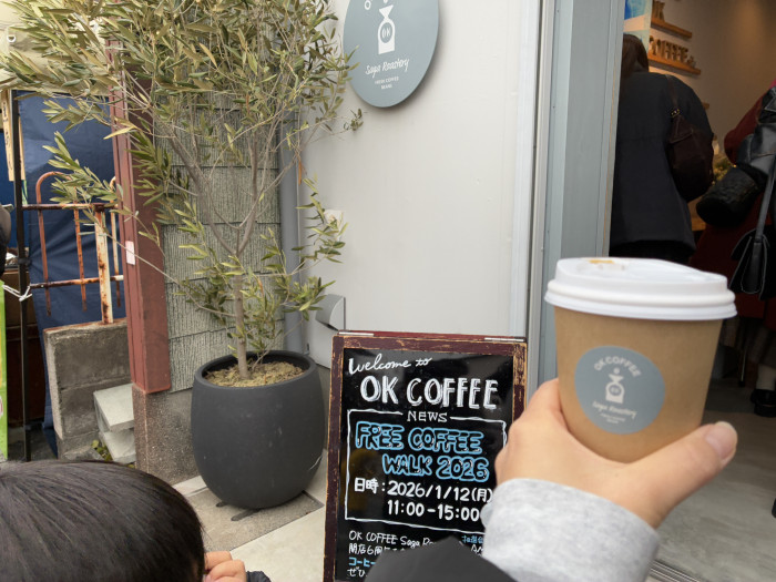 吉野ヶ里町で行われるイベント「FREE COFFEE WALK2026」。同町にあるカフェ「OK coffee Saga roastery」が旗振り役となり、お店の周年祝いに合わせ、昔は賑わっていたという駅近の商店街通りを盛り上げようという思いで取り組まれています。