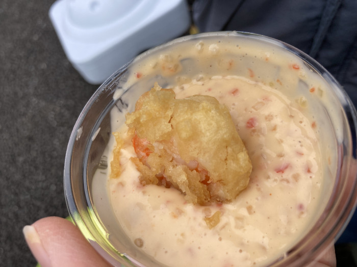その後、各店舗へ。こちらは近くに店舗がある「EBI研究所」のエビマヨ!ぷりぷりの海老と、もちっとした衣をたっぷりマヨに絡めていただきます。