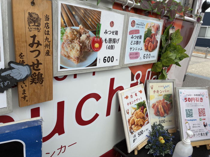 こちらは神埼市吉野ヶ里町の「みつせ鶏本舗」のキッチンカー。ここのからあげが美味しいんです…!通常のからあげが完売していたので、どぶ漬けのタレからあげと、ヤンニョムチキンを購入。