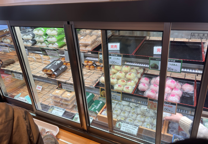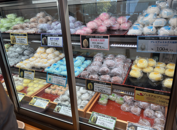 店内入り口をくぐると、まず最初に見えるのはショーケースにズラーっと並ぶ、彩り鮮やかな大福餅たち。