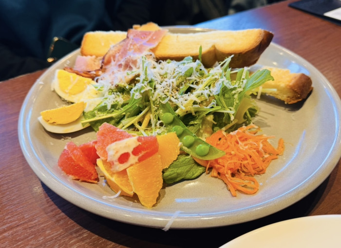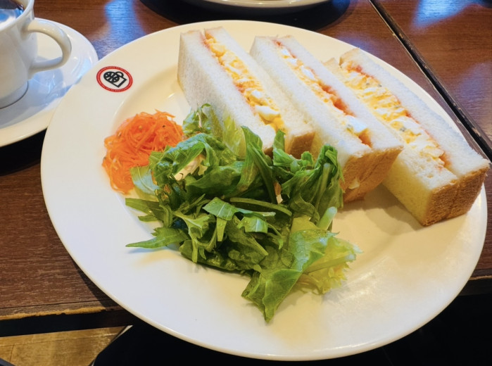 この日は朝早くに訪れたため、モーニングをいただきました。モーニングは7:30〜11:00頃まで提供され、定番の「パン+ゆで卵セット」など軽めのものもありますが、私はしっかりいただきたかったので、「たまごサラダサンド」830円をオーダー。セットドリンクはブレンドコーヒーにしました。