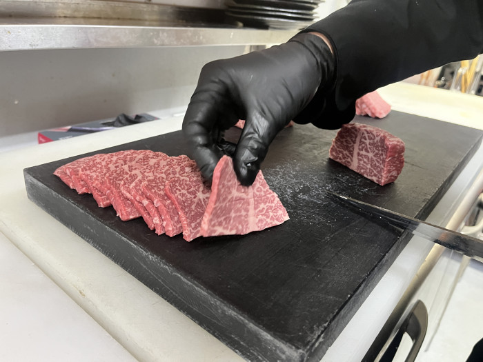 今回、特別に厨房にも入らせていただき、普段は見ることのできない“仕込みの現場”を見学する機会をいただきました。そこでまず目を奪われたのが、能登牛の迫力ある塊肉。まさに芸術品のような霜降りで、肉そのものが放つ存在感がハンパないです。