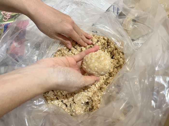 作業は、まず塩と麹を混ぜるところから。麹はやや固めなので、手でほぐしながら塩をなじませていきます。ふわっと立ち上る麹の香りに、発酵の力を感じる瞬間です。味噌作りで一番大変な「大豆を煮て潰す工程」は、すでにミンチ状に加工された大豆を受け取れるため、驚くほどラク。仕込みは1日で完了します。