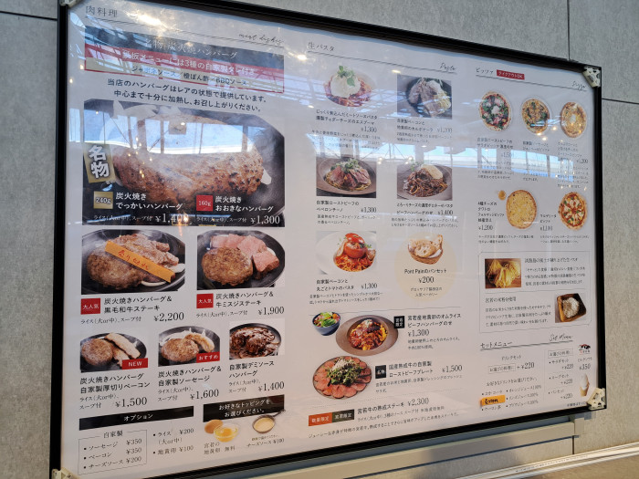 メニューは、ハンバーグ、お肉、生パスタ、ピザなど。