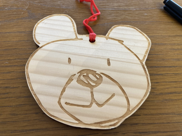 ミュージアムのマスコット「デンちゃん」を模った絵馬に願いを書いて奉納。