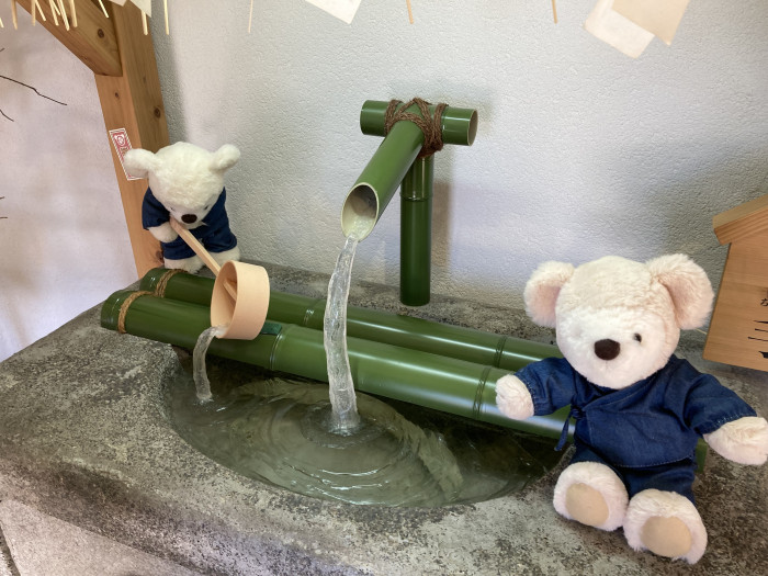 手水舎には作務衣を着た可愛らしいくまちゃんが!