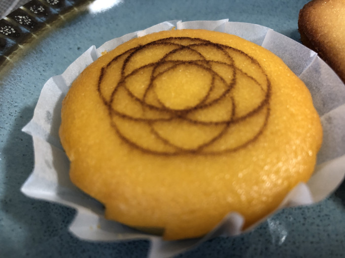 見た目はマドレーヌのようですが、食べてみるとしっとりとした上品な和菓子。描かれた模様も美しいです。
