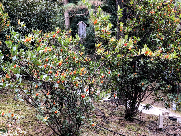 高台寺の境内を山側に登っていくと、重要文化財に指定されている、二つの茶室があります。茶室までの道のりは、緑豊か。オレンジ色の実をつけた可愛い植物もありました。
