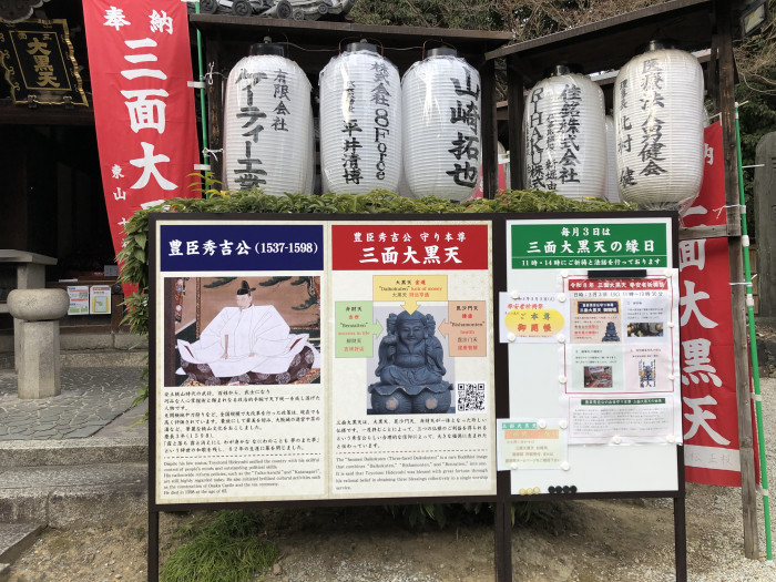 三面大黒天とは、大黒天・毘沙門天・弁財天が合体した像で、比叡山延暦寺で最澄が彫った仏像が始まりとのこと。戦国時代には秀吉のほか、織田信長も三面大黒天を信仰していたのだとか。
