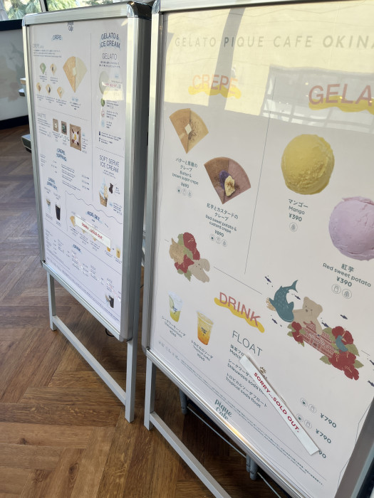 沖縄感のあるデザインのジェラートピケカフェではクレープやアイスなどのスイーツメニューを楽しむことができます。